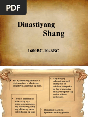 A ng dinastiya ng Shang ang unang pangkat ng mga dayuhang katutubo na nanirahan sa may ibabang bahagi ng ilog Dilaw o ang Huang HoAyon sa pananaliksik at talaan ng mga Arkeologo masasabing ang dinastiya ng Shang ang lehitimong nauna sa kabihasnan ng Tsina. View KABIHASNANG SHANGdocx from BEED 0117301149 at Systems Plus College Foundation.
